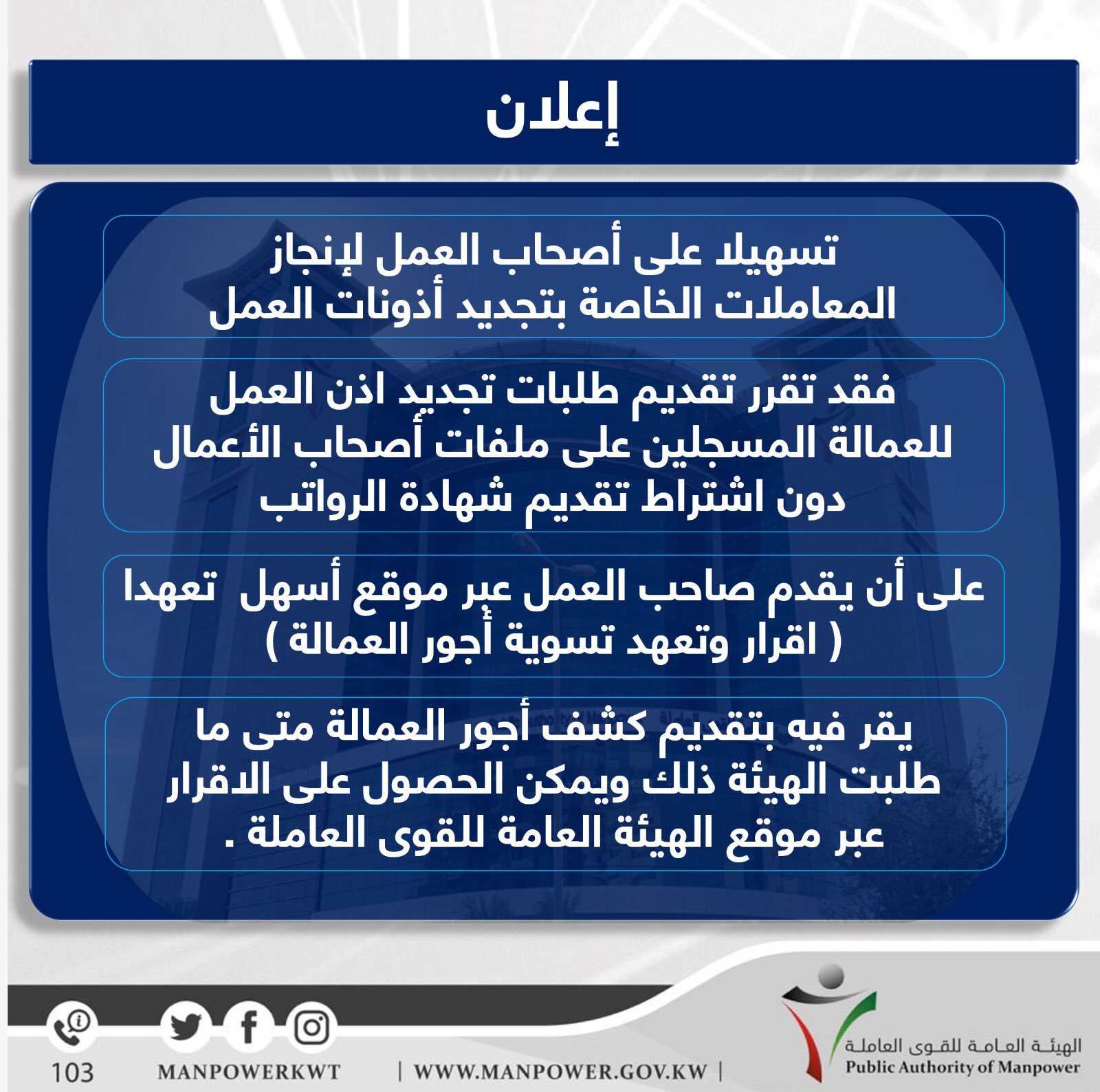 القوى العاملة تجديد إذن العمل للمسجلين على ملفات أصحاب الأعمال دون تقديم شهادة الرواتب المسايل نيوز اخبار الكويت أخبار كل يوم