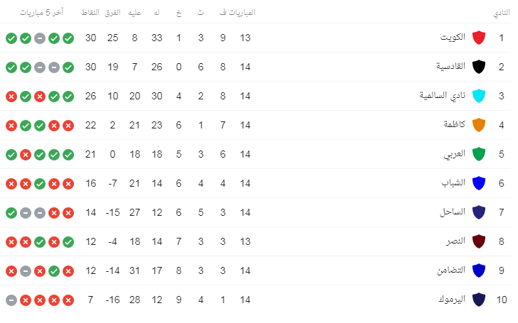 جدول ترتيب الدوري الكويتي بعد نهاية الجولة الـ11 التيار الاخضر