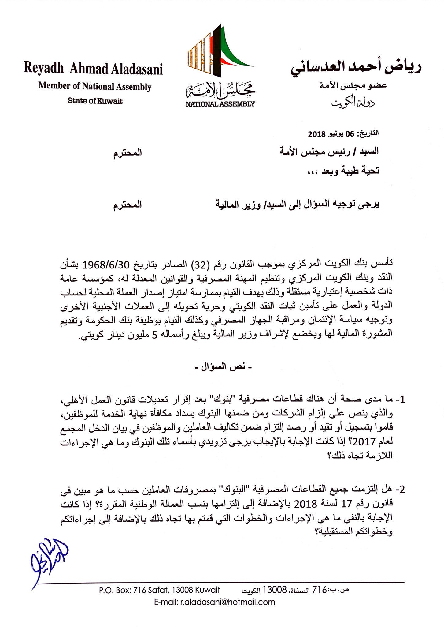 رياض أحمد العدساني A Twitter تقدمت بسؤال برلماني لوزير المالية بشأن رقابة بنك الكويت المركزي على البنوك ومدى إلتزامها بتنفيذ قانون العمل في القطاع الأهلي وتعديلاته فيما يخص 1 نهاية خدمات العاملين