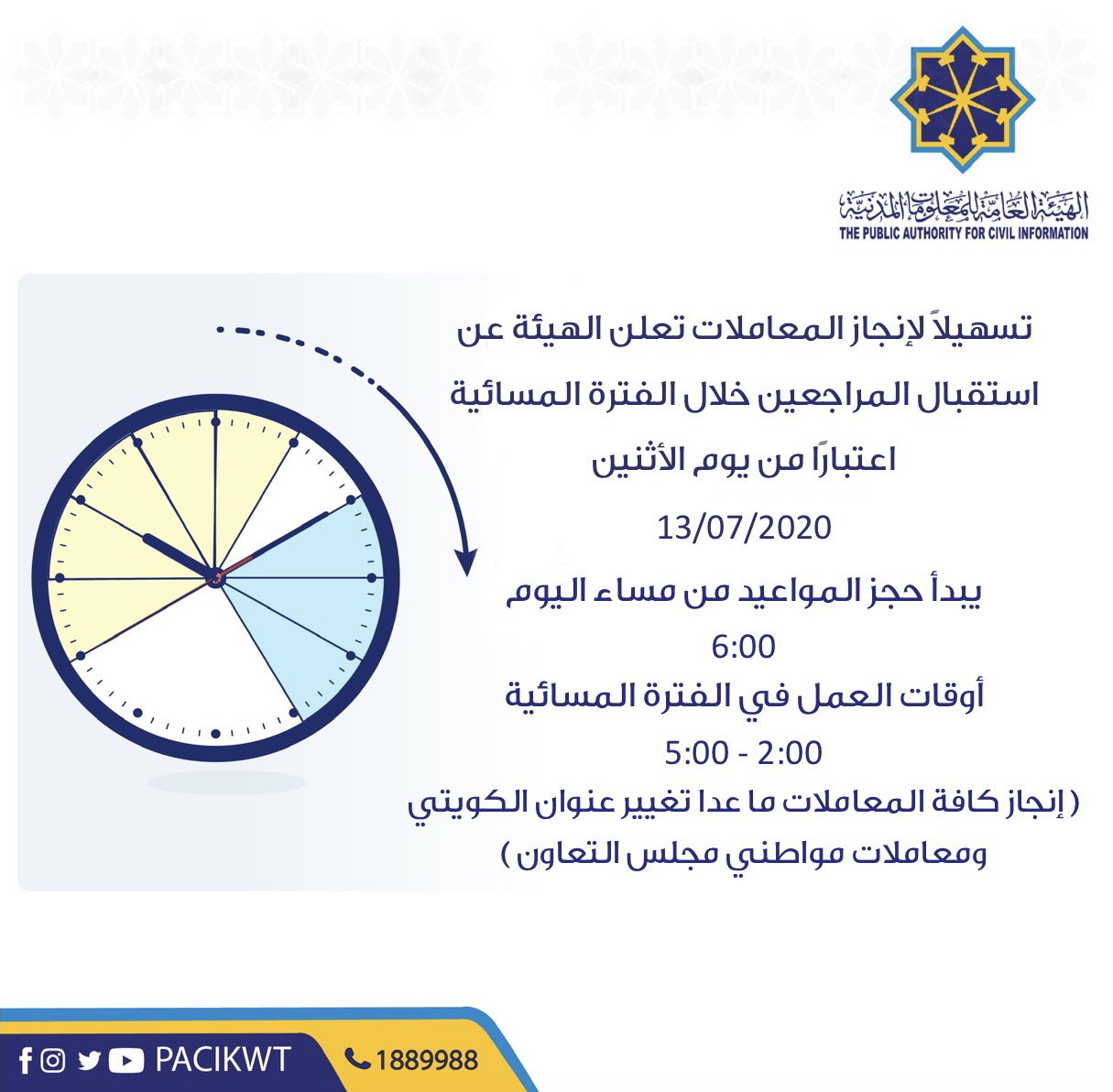 الهيئة العامة للمعلومات المدنية On Twitter نستقبلكم خلال الفترة المسائية اعتبارا من يوم الأثنين 13 7 2020 من الساعة 2 00 وحتى الساعة 5 00 يبدأ حجز المواعيد للفترة المسائية اليوم الساعة 6 00 مساء المعلومات المدنية Https T Co Qcztvnpzjj