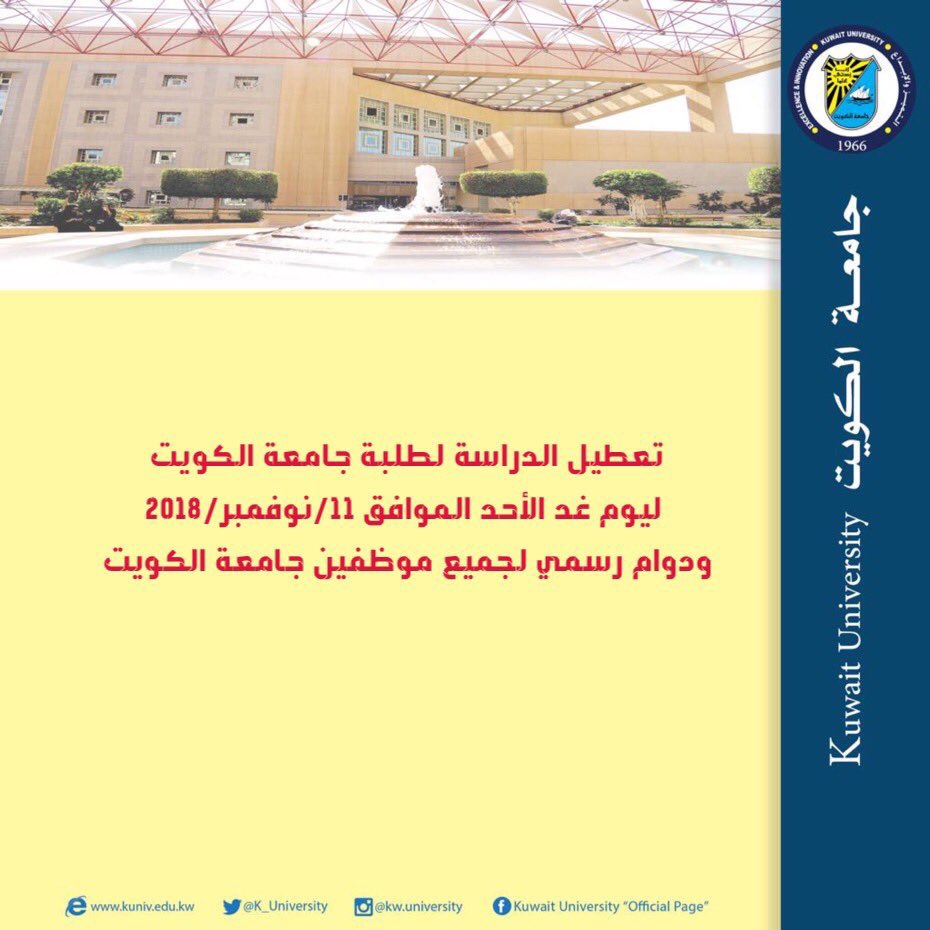 Kuniv News على تويتر بناء على الظروف المناخية التي تشهدها البلاد مؤخرا وحفاظا على سلامة الطلبة والطالبات أعلن المتحدث الرسمي بجامعة الكويت د مثنى الرفاعي عن تعطيل الدراسة ليوم غد الأحد الموافق