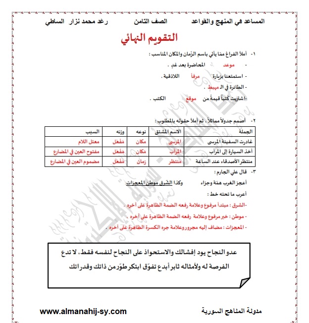 مجموعة اوراق عمل اسماء الزمان والمكان لمادة اللغة العربية الصف الثاني عشر الفصل الاول منتديات صقر الجنوب