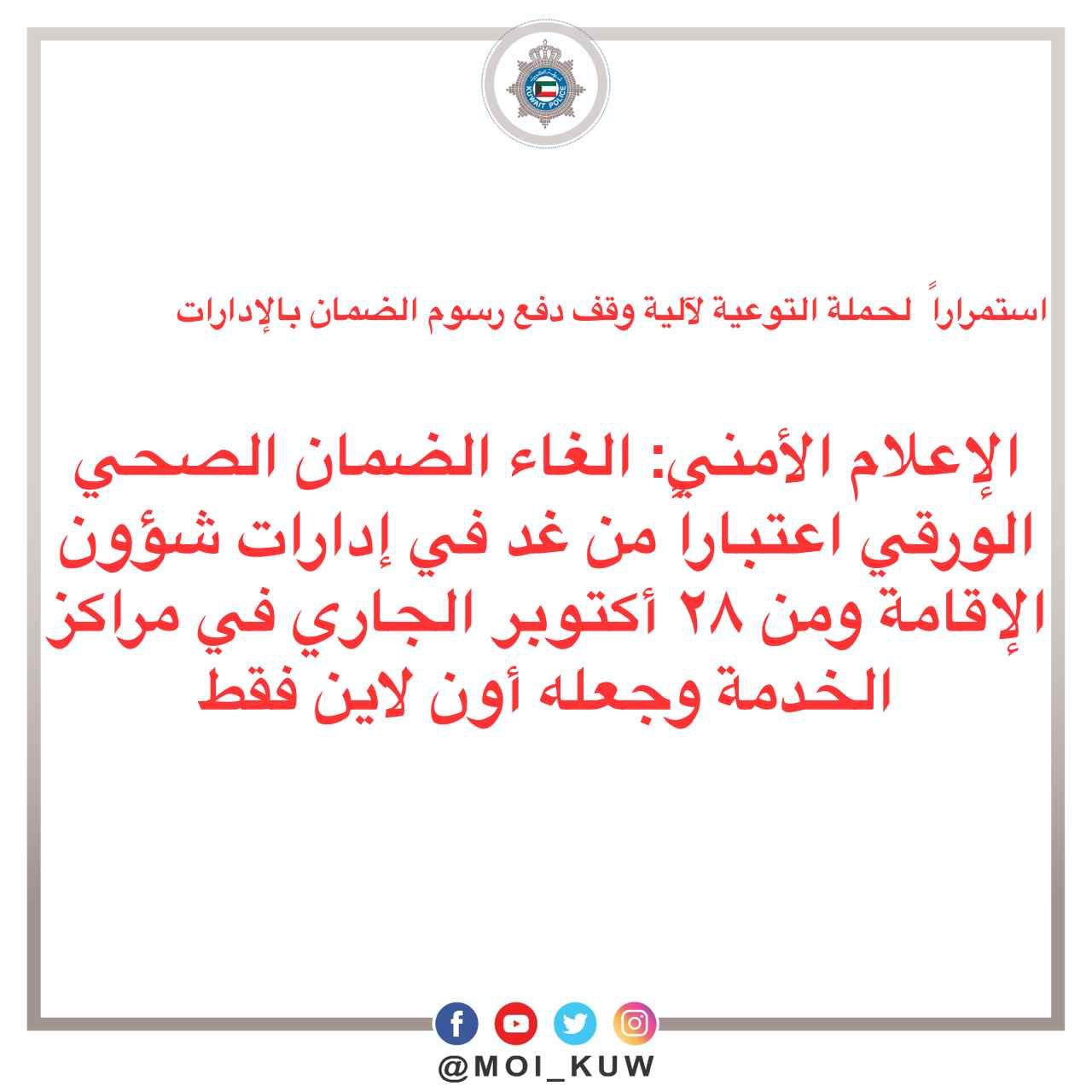 وزارة الداخلية On Twitter تقرر اعتبارا من يوم غد الاحد 6 10 2019 الغاء العمل بالاشعار الورقي للضمان الصحي والعمل بنظام خدمة الدفع الآلي أون لاين لحملة كافة مواد الإقامة في جميع ادارات شؤون