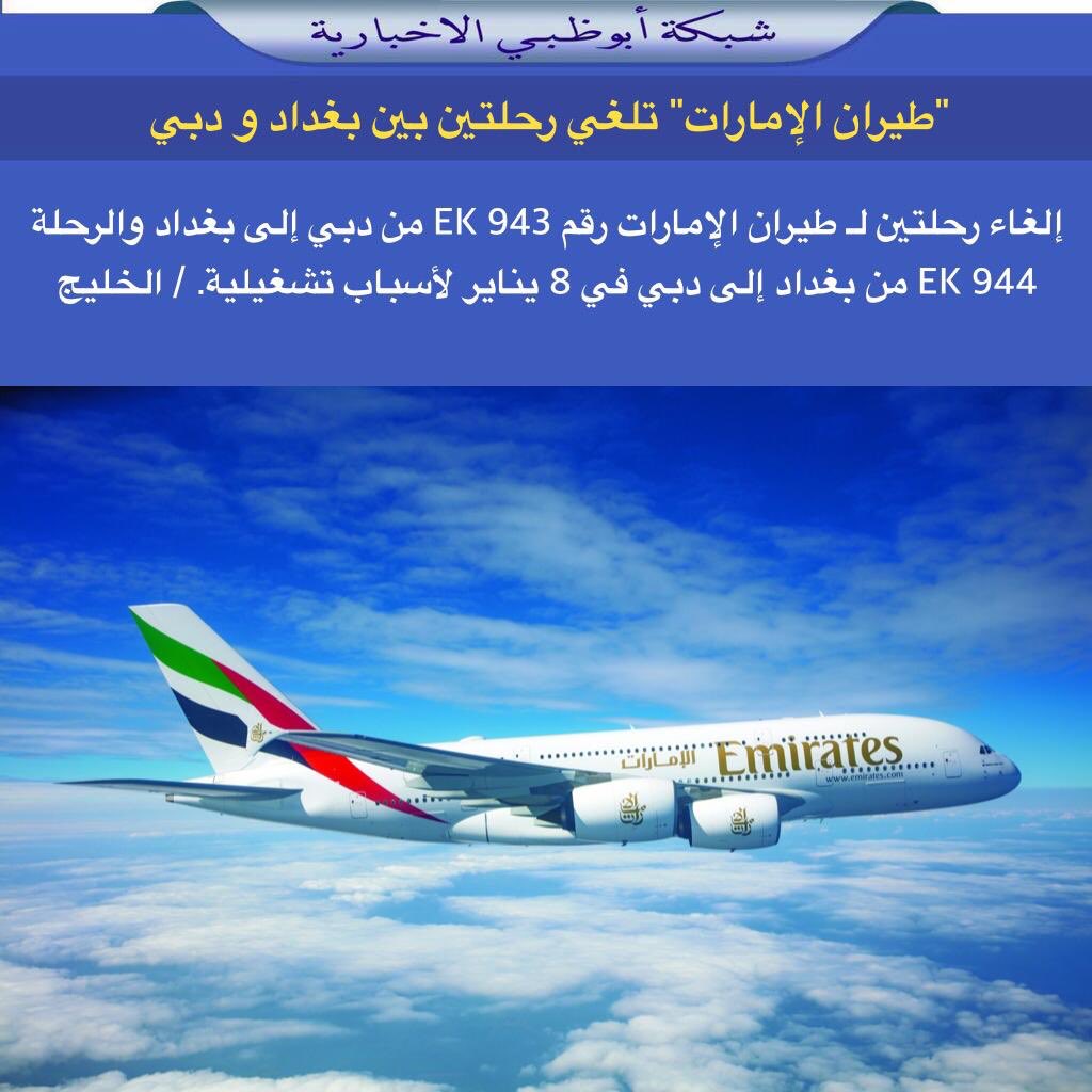 شبكة أبوظبي Pa Twitter طيران الإمارات تلغي رحلتين بين بغداد ودبي إلغاء رحلتين لـ طيران الإمارات رقم Ek 943 من دبي إلى بغداد والرحلة Ek 944 من بغداد إلى دبي في