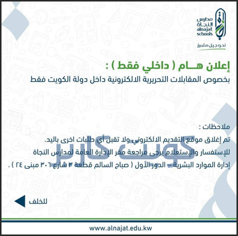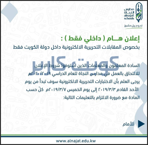 دليل اجراء المقابلات التحريرية للتوظيف بمدارس النجاة الكويتية بدأ من 3 مارس 2019