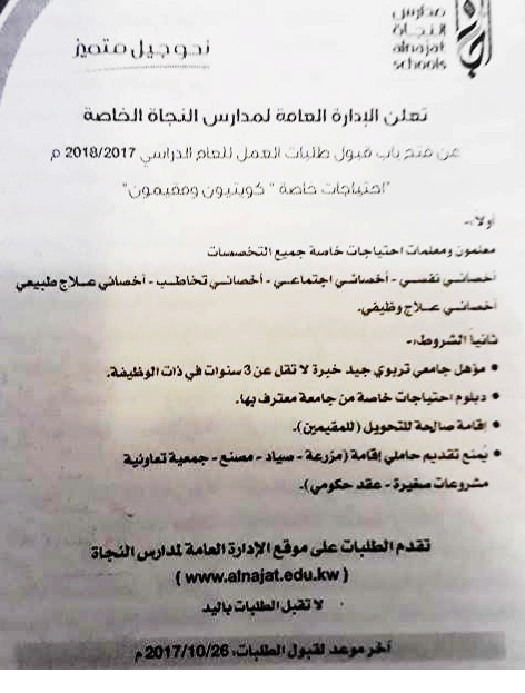 رسميا بدأ قبول طلبات العمل بمدارس النجاة قسم الاحتياجات الخاصة 24 10 2017