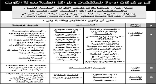 كبرى شركات ادارة المستشفيات والمراكز الطبية بالكويت تعلن عن رغبتها فى توظيف الكوادر الطبية التالية