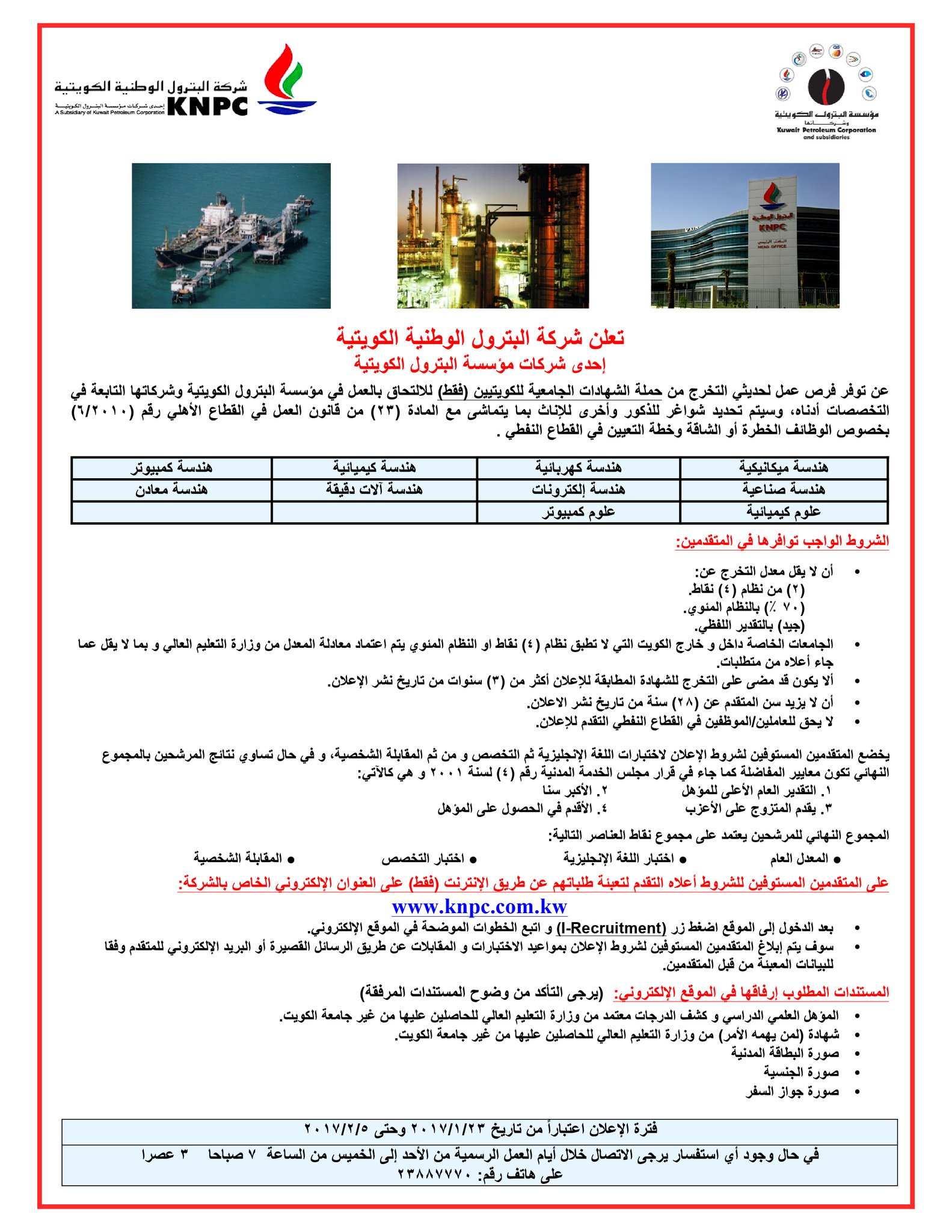 تحديث إعلان عن وظائف شاغرة لدى شركة البترول الوطنية Knpc