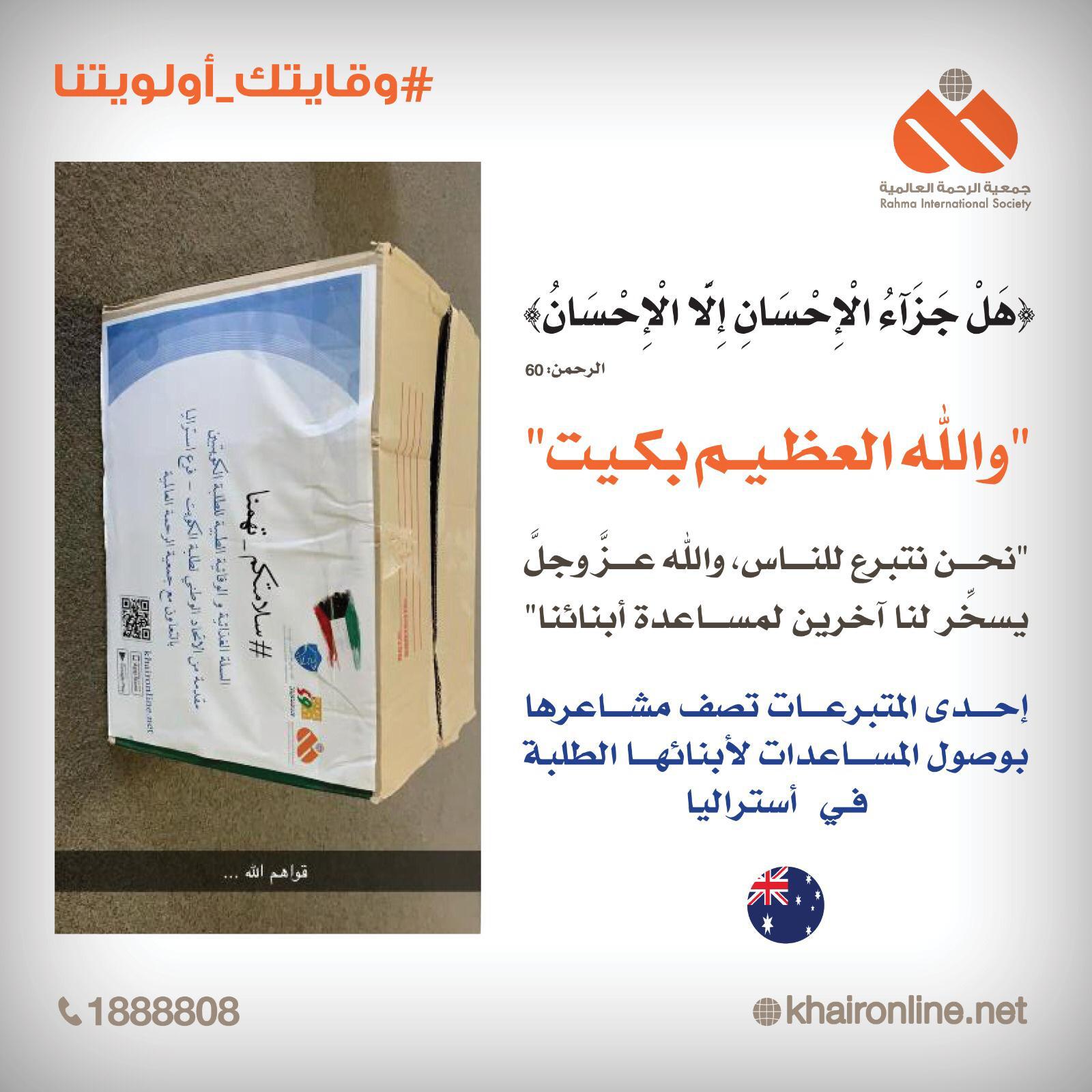 جمعية الرحمة العالمية On Twitter هل جزاء الإحسان إلا الإحسان إحدى المتبرعات تصف مشاعرها بعد وصول المساعدات لإبنتها الطالبة في استراليا وقايتك أولوليتنا الكويت بخير Https T Co Wrprpaukia
