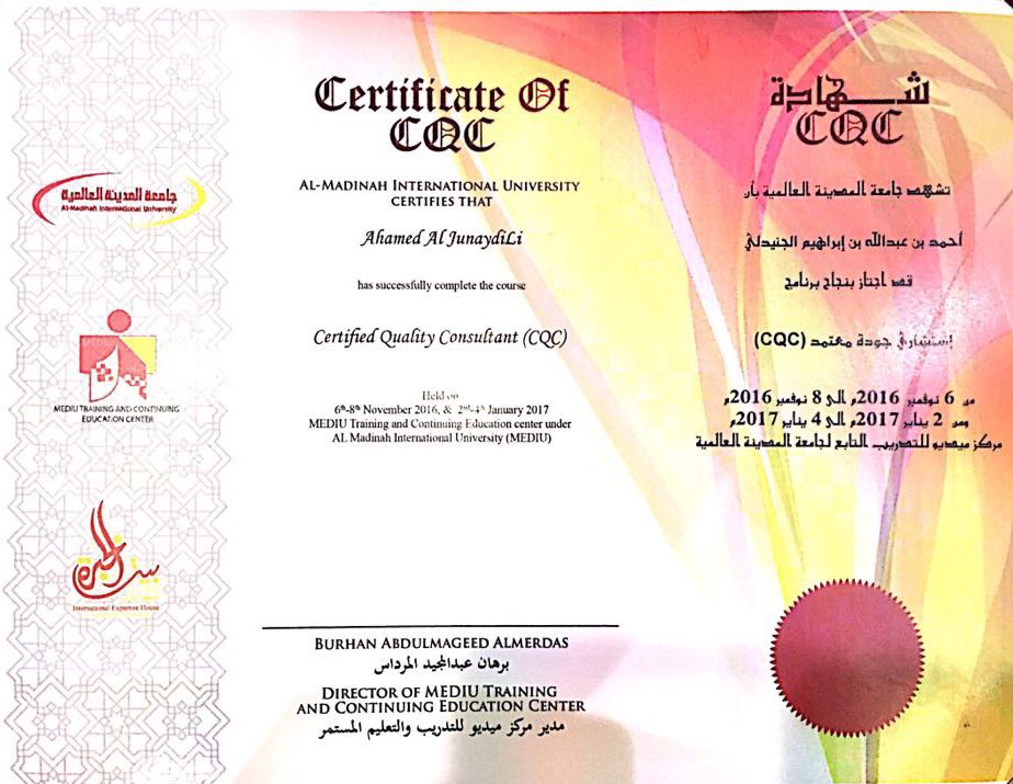 لجنة التنمية بحي الريان والنهضة Pa Twitter نبارك للاستاذ أحمد بن عبدالله الجنيدلي مدير اللجنة للقسم الرجالي حصولة على شهادة استشاري جودة معتمد من جامعة المدينة العالمية Https T Co Q5bdo2ht9b