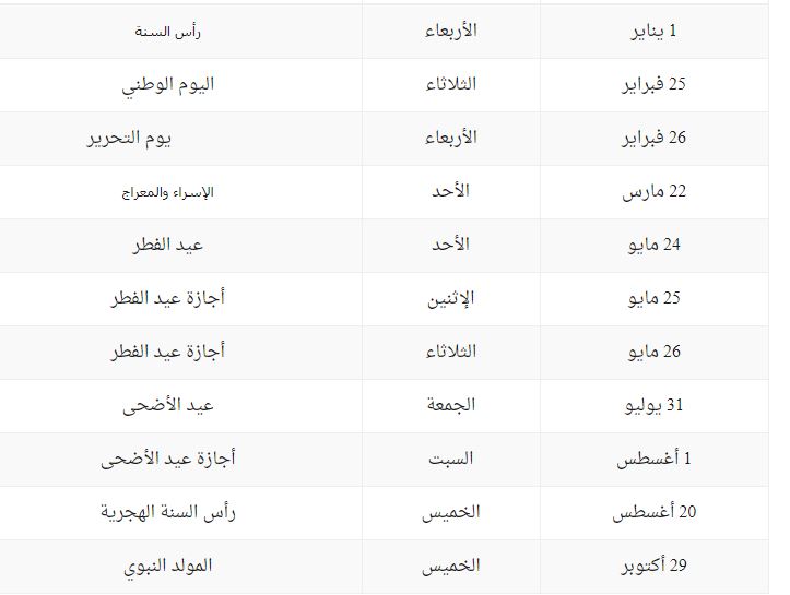أيام الإجازات والعطلات الرسمية الوطنية والدينية لعام 2020 ميلادية