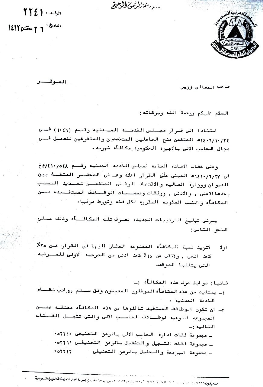 قــqararــرار On Twitter عليكم السلام هذا تعميم الخدمة المدنية رقم 2241 بتاريخ 1412 1 26هـ يشير إلى قرار مجلس الخدمة المدنية رقم 1046 في 1406 10 24هـ بخصوص مكافأة العاملين في مجال الحاسب الآلي ولم أجد