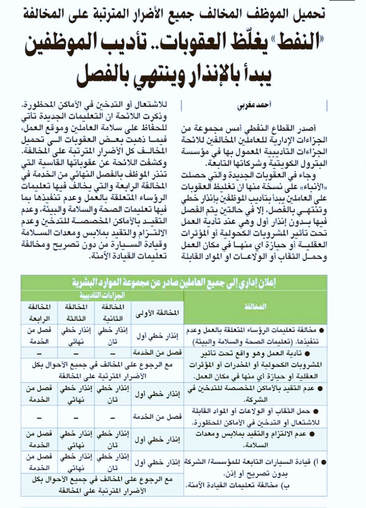 جريدة الجريدة الكويتية الصبيح لإلغاء لائحة الجزاءات الجديدة في النفطي