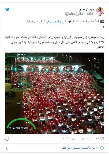 المؤسسة العامة لجسر الملك فهد On Twitter جسر الملك فهد يواصل تسجيل الأرقام القياسية مع مطلع العام 2020 وشهر يناير يسج ل أعلى عدد للمسافرين خلال شهر واحد منذ افتتاحه 3 095 963 مسافر 99 870 معدل المسافرين