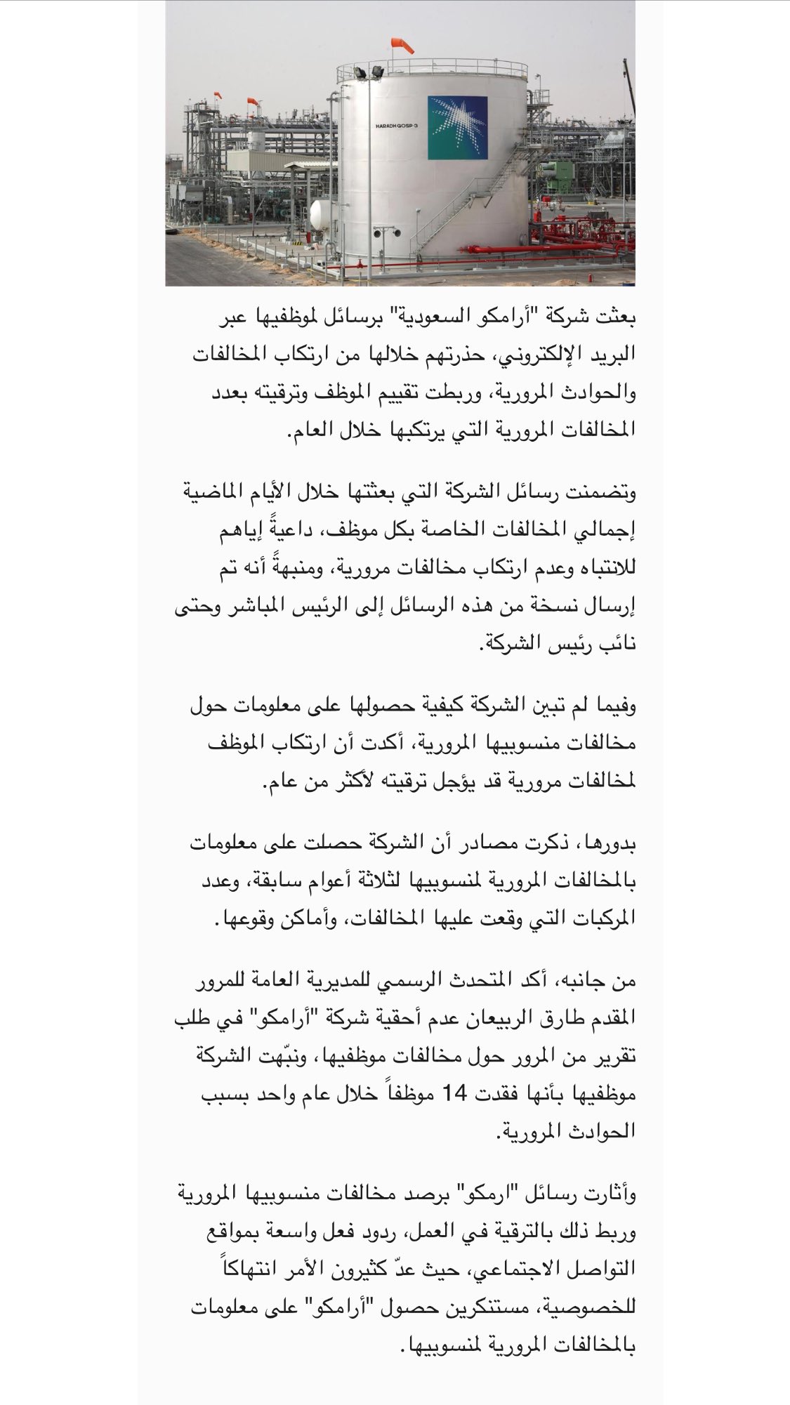 كافيه الشرقية نعود بحذر V Twitter أرامكو ترصد المخالفات المرورية لمنسوبيها وتربط ترقيتهم بعدد المخالفات المرتكبة