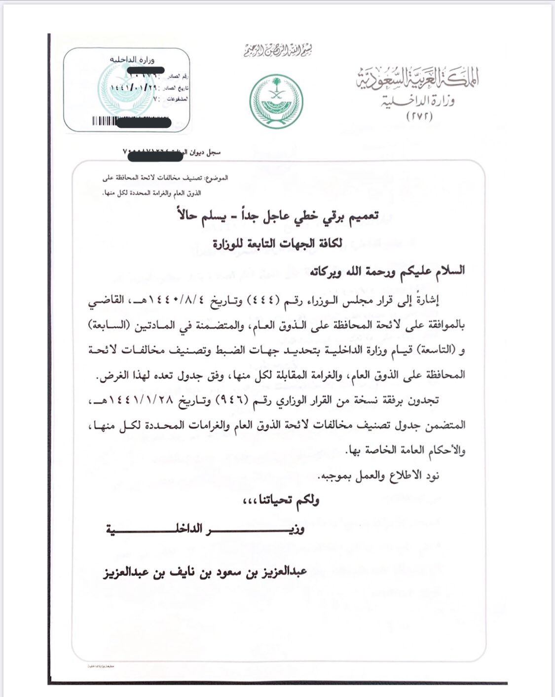 مختارات عدلية Pa Twitter قرار وزير الداخلية رقم ٩٤٦ وتاريخ ١٤٤١ ١ ٢٨هـ المتضمن جدول تصنيف مخالفات لائحة الذوق العام والغرامات المحددة لكل منها ٧ صفحات تشمل التعميم والقرار وجدول تصنيف