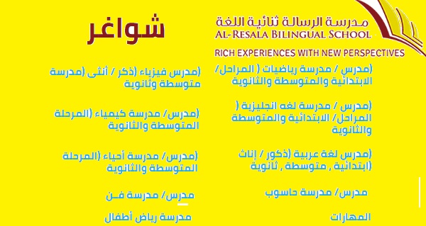 وظائف مدرسة الرسالة ثنائية اللغة لعدد من التخصصات 15000 وظيفة