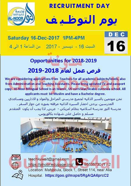 تعلن مدرسة النور بالكويت تنظيم يوم مفتوح للتوظيف السبت 16 ديسمبر 2017 كويت شير