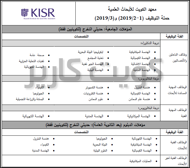 إعلان توظيف إعلان معهد الكويت للأبحاث العلمية للجامعيين حديثي التخرج وذوي الخبرة