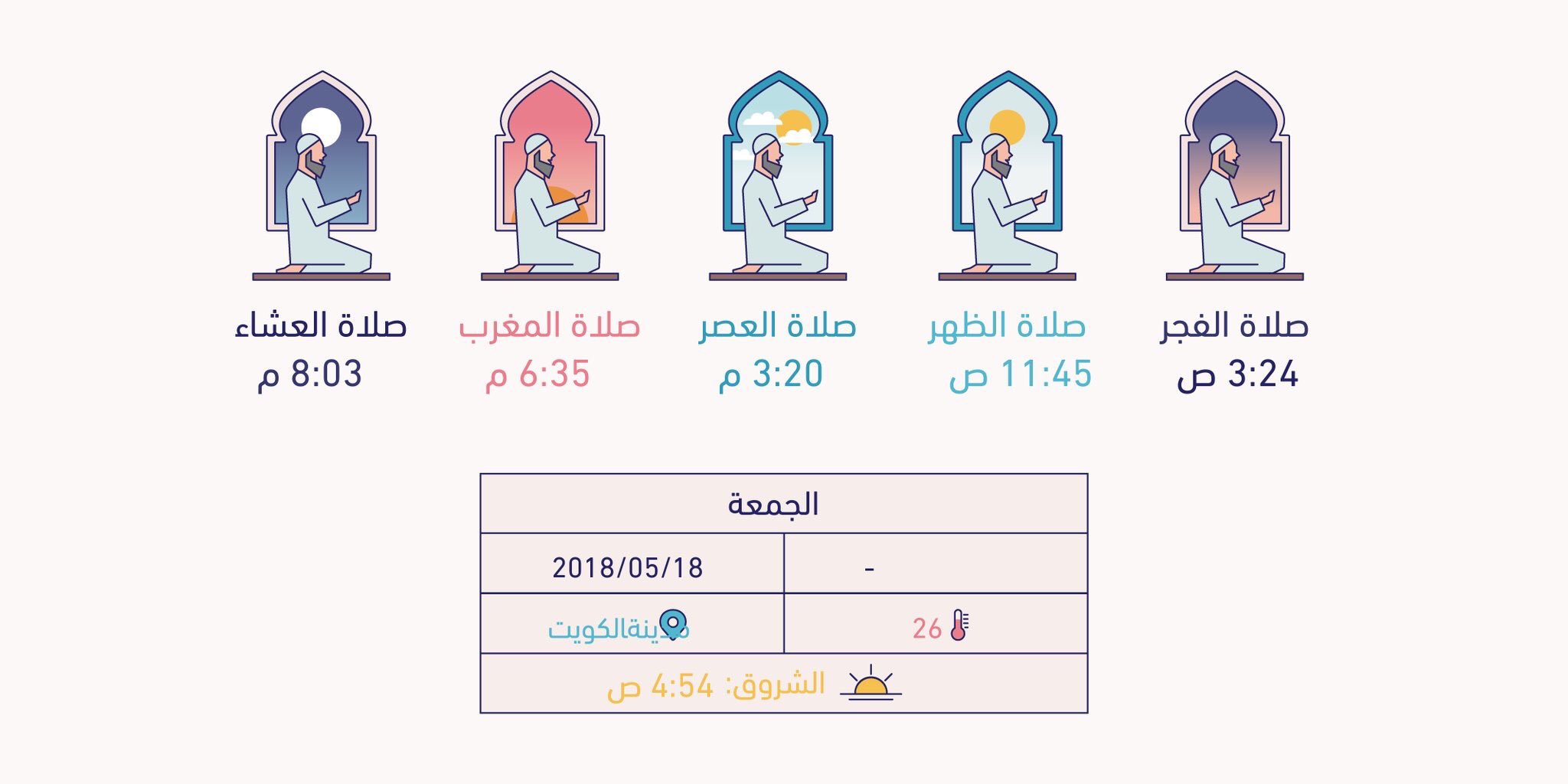 الجهراء اليوم On Twitter مواقيت الصلاة لليوم الجمعة بمدينة الكويت الفجر 3 24 ص الظهر 11 45 ص العصر 3 20 م المغرب 6 35 م العشاء 8 03 م