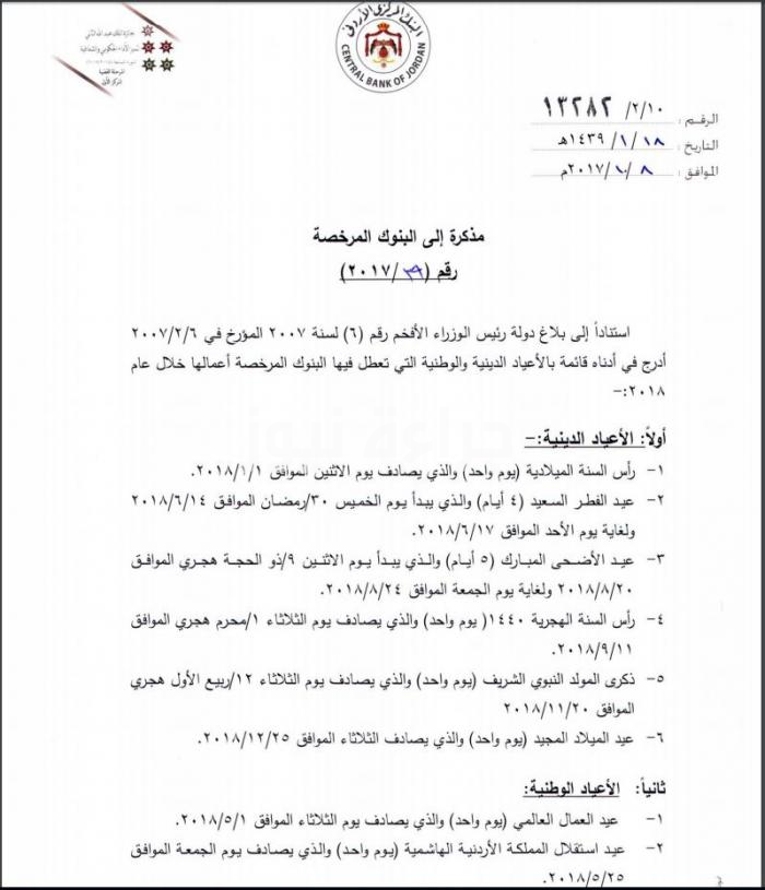 الحكومة تعلن عن مواعيد وأيام العطل الرسمية للعام القادم 2018