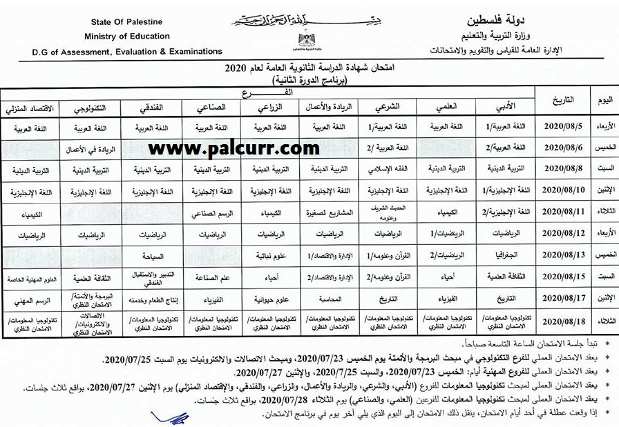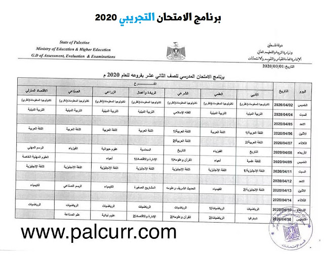 برنامج امتحانات التوجيهي لعام 2020 تجريبي ووزاري المنهاج الفلسطيني الجديد