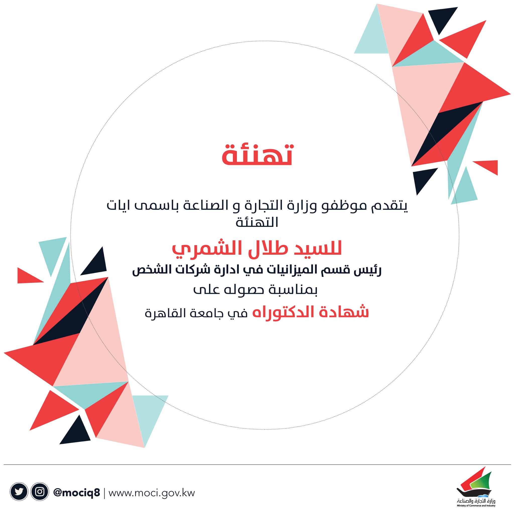 وزارة التجارة Na Twitterze يتقدم جميع موظفين وزارة التجارة والصناعة بأسمى آيات التهنئة للسيد طلال الشمري رئيس قسم الميزانيات بمناسبة حصوله على شهادة الدكتوراة من جامعة القاهرة Https T Co Qvbwurzaqe