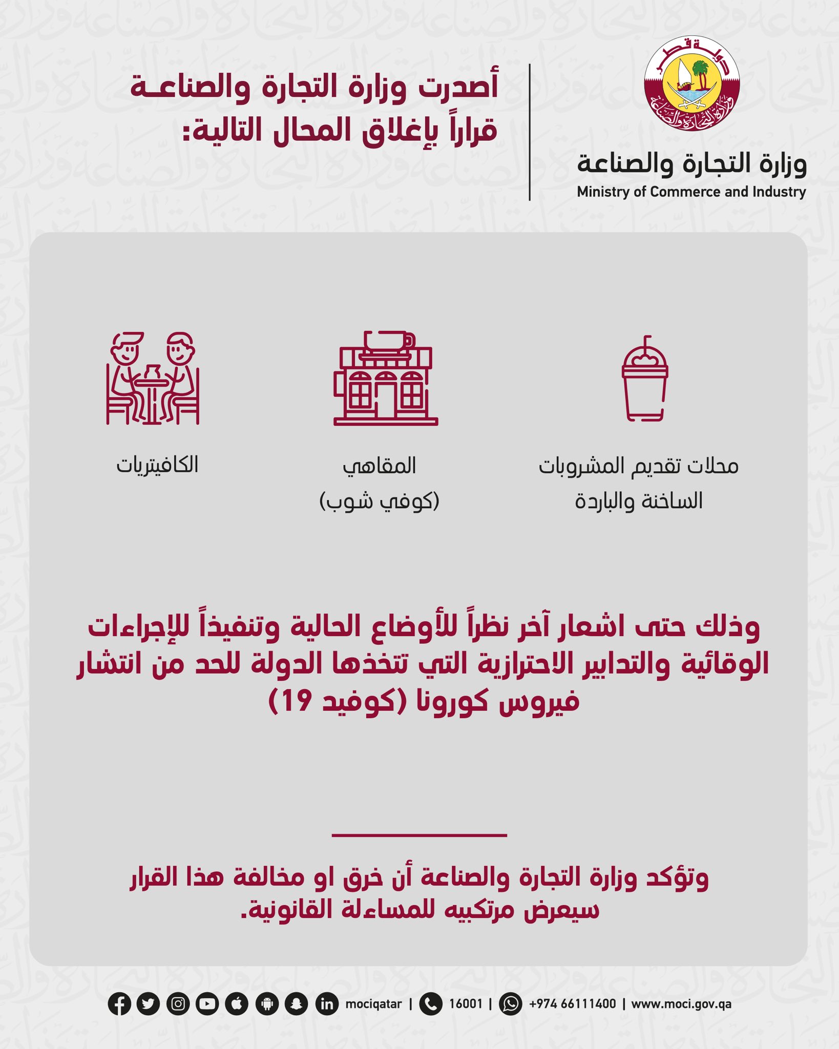 وزارة التجارة والصناعة On Twitter أصدرت الوزارة قرارا بإغلاق المحال التالية محلات تقديم المشروبات الساخنة والباردة والمقاهي كوفي شوب والكافيتريات وذلك حتى اشعار آخر قطر سلامتك هي سلامتي Https T Co J1nn0bw5ko