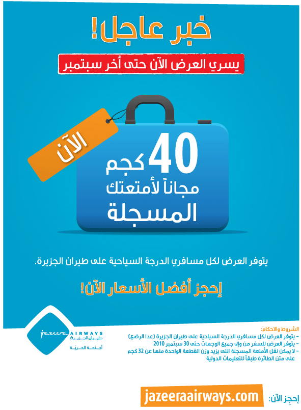 وزن طيران الجزيرة. استخدم كود الخصم fly10. يجب الإعلان عن جميع القطع المحمولة في عدادات تسجيل الوصول وخطوط طيران الجزيرة يجب إرفاق العلامات المحمولة على كل. يدويا عند كاونتر التسجيل والحصول على ملصق واحد خاص بطيران الجزيرة لكل. حجز تذاكر طيران الجزيرة airplane.