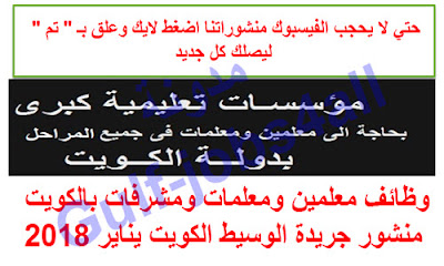 وظائف معلمين ومعلمات ومشرفات بالكويت منشور جريدة الوسيط الكويت يناير 2018