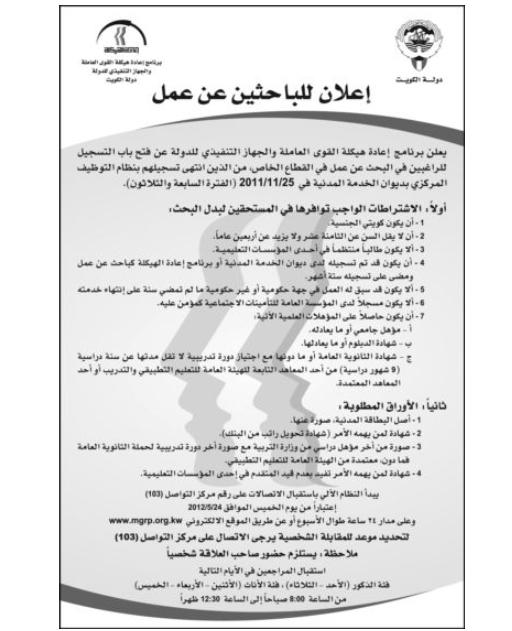 وظائف الكويت وظائف جريدة الرأى الكويتية 27 5 2012 الموافق 6 رجب 1433 فتح باب التسجيل للراغبين فى العمل فى الجهاز التنفيذى للدولة